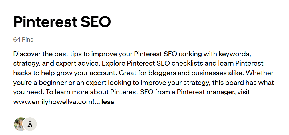 Here you can see an example of one of my Pinterest boards, optimized with keywords in the title and description. Check out my profile to see how I set things up!